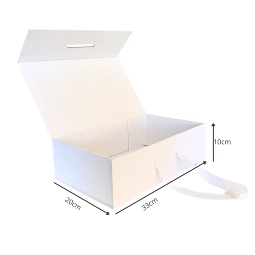 Cajas magnéticas con manilla en color blanco y negro, disponibles en 3 tamaños (15x13x5, 33x20x10 y 40x30x10). Fabricadas con cartón extra grueso y cierre imantado de alta resistencia. Ideales para joyería, ropa, regalos corporativos y packaging premium para negocios que buscan una presentación elegante y profesional.